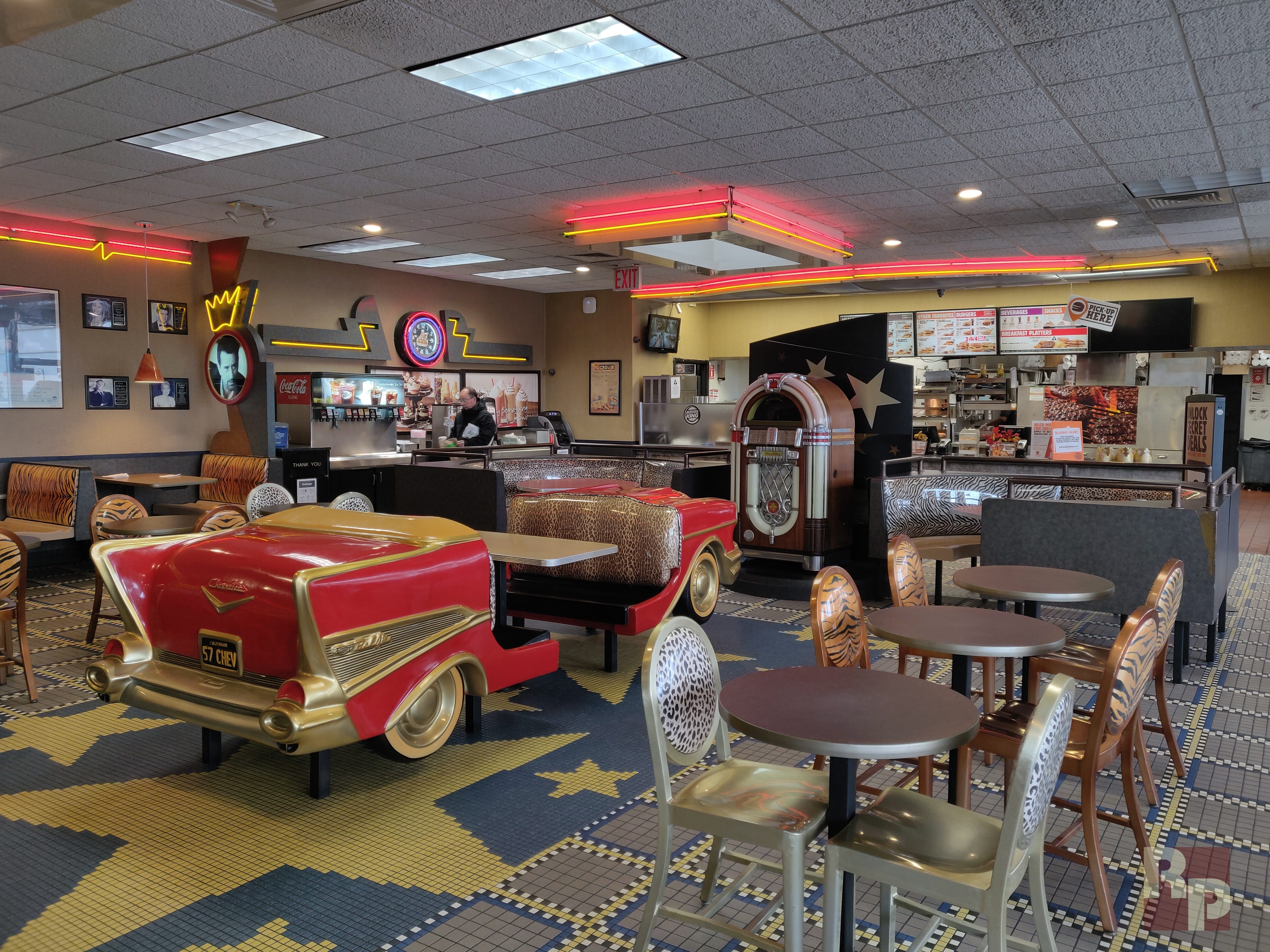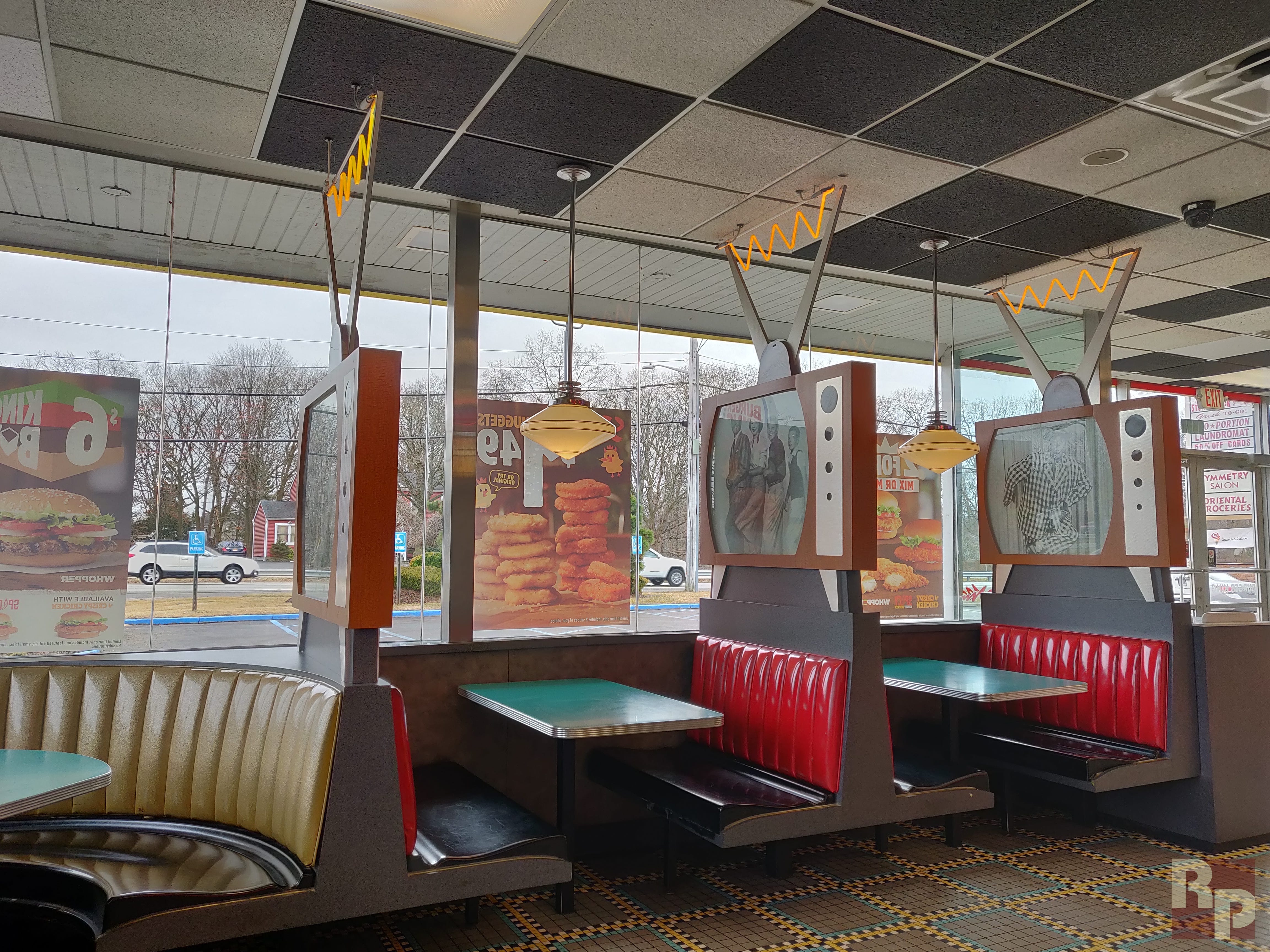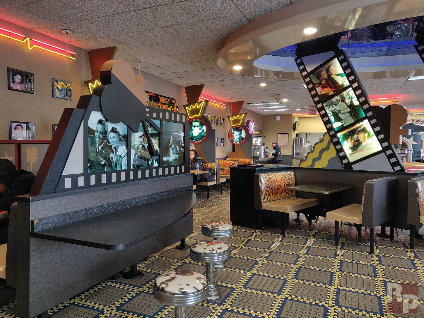 We’ll be taking a look at two Burger King restaurants today. From the outside, they are your normal run of the mill BK specimens, from an era before the bland minimalist “shoebox” remodels that have taken hold lately. Inside however, diners are greeted with neon lights, movie posters, Cadillac inspired booths, and movie star head-shots. These were part of a series of interior remodels that were rolled out throughout the 1990s and into the early aughts to hearken back to both 50s Rock ‘n Roll and Hollywood culture and aesthetics. These two here, embrace the Hollywood.