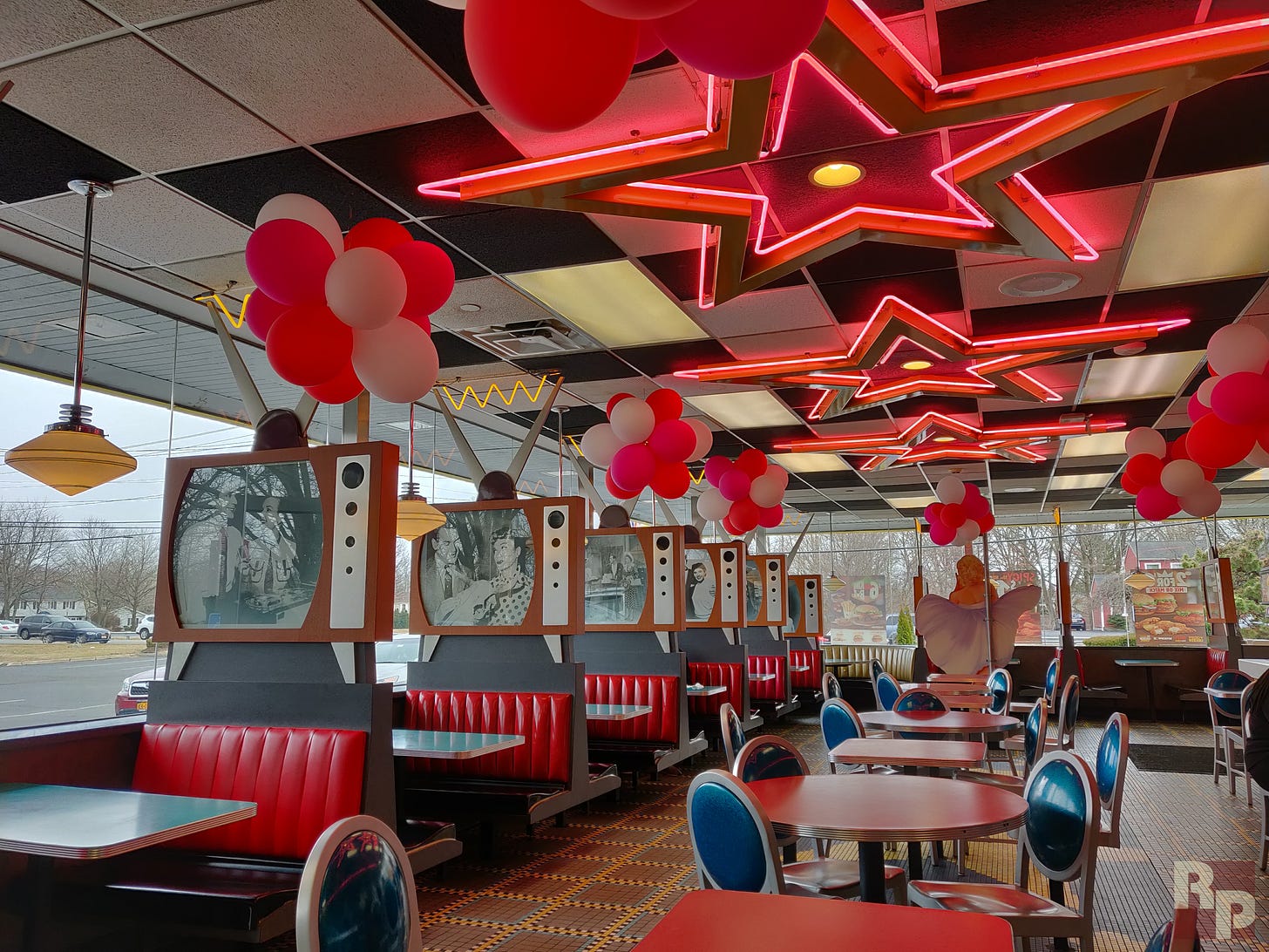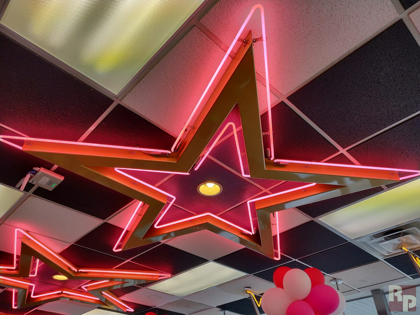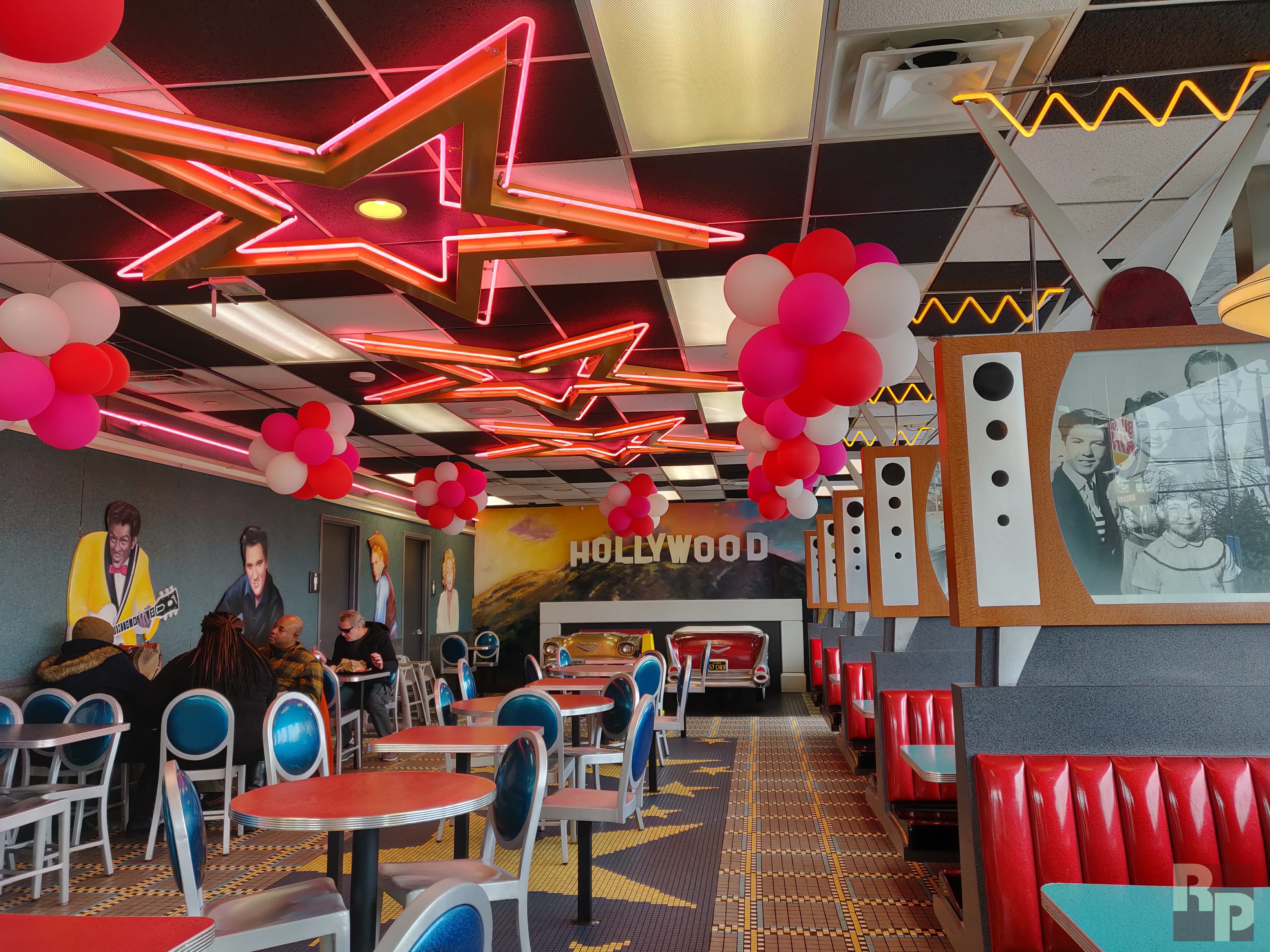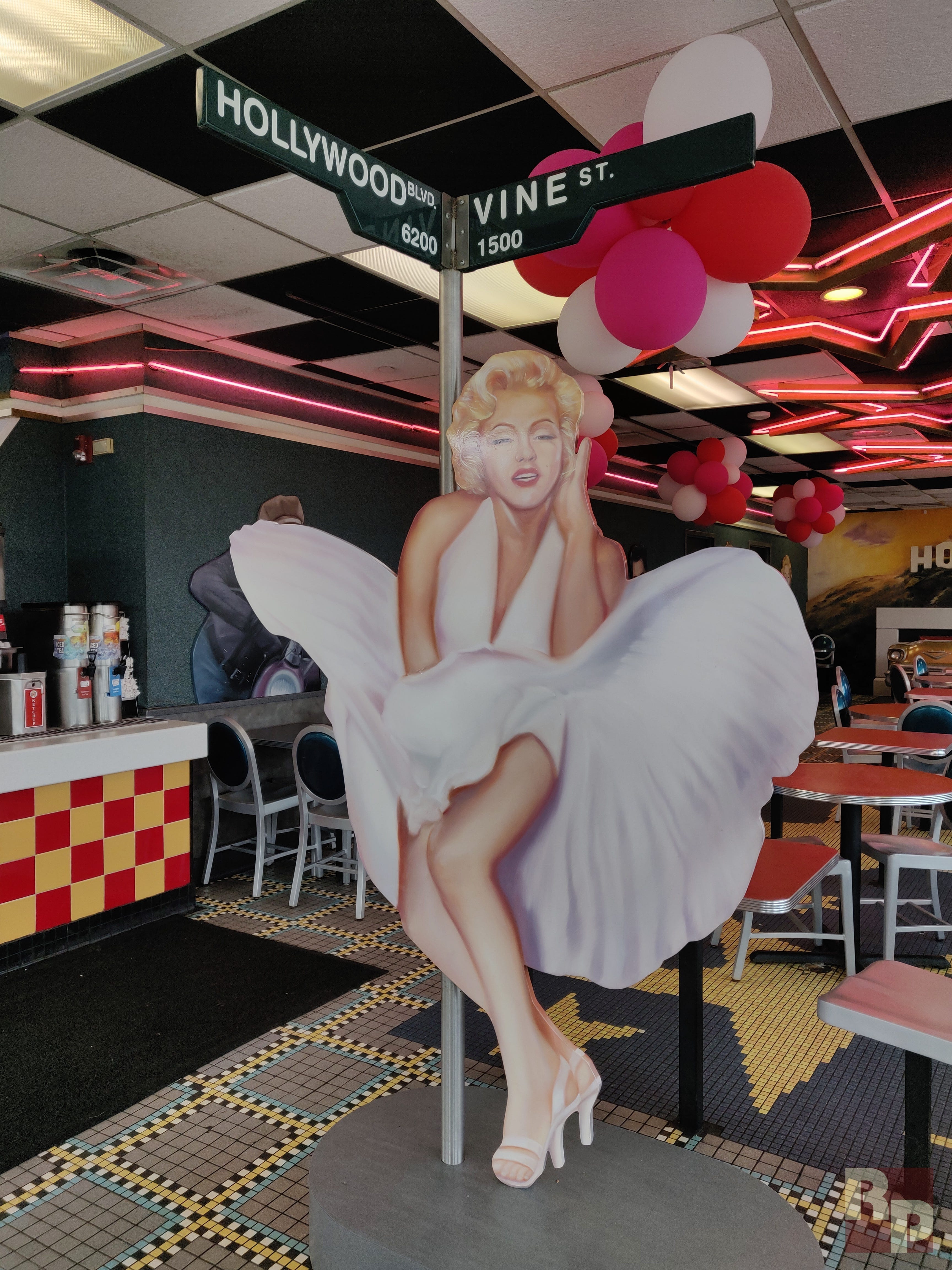 This location goes even further down into the depths of Hollywood excess, and we are here for it. Giant pink neon stars graced the ceiling over the dining room. A Marilyn Monroe standee greets diners, replicating that famous subway grate scene from 1955’s “The Seven Year Itch”. More car themed booths, as well. Each divider, a 50s Television set. The fate of this location? Remodeled around the time of the Covid-19 lockdowns.. just another box.